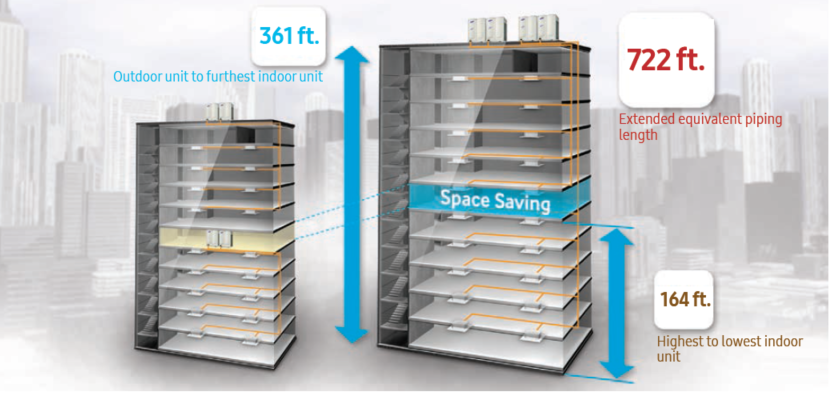 DVM S2 systems** offer installation flexibility with extended piping length up to 722 ft., vertical separation up to 361 ft. between the outdoor unit and furthest indoor unit, and 164 ft. between the highest and lowest indoor units.