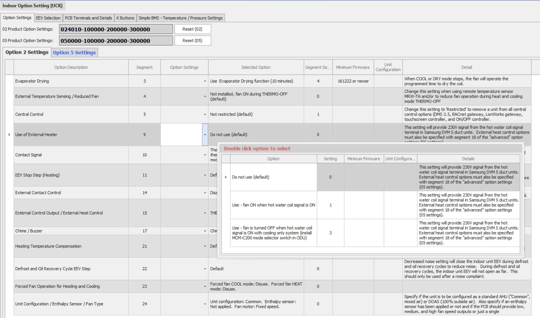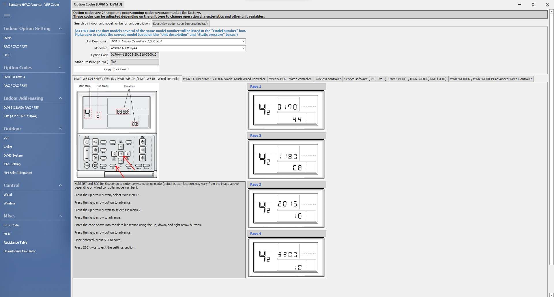 Samsung HVAC's VRF Coder software supports unit option code lookup and programming instructions, error code lookup, outdoor unit option setting, refrigerant calculator, and various other service related functions. Used for general information regarding DVM S systems, DVM Chiller, and Samsung Mini Splits sold in North America.